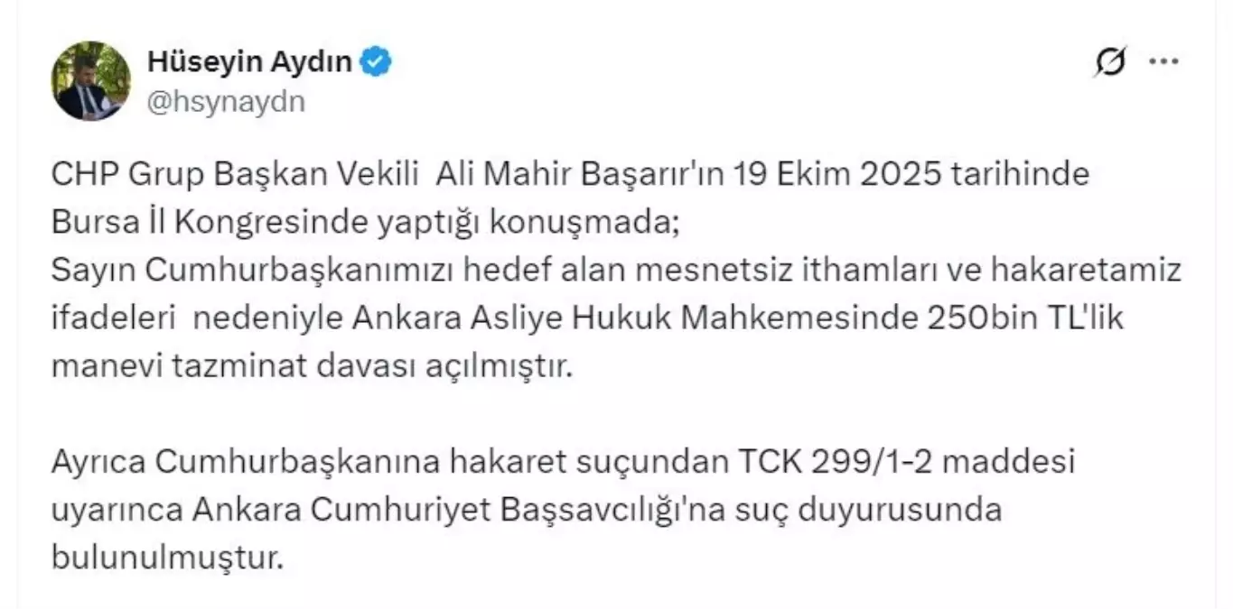 Cumhurbaşkanı Recep Tayyip Erdoğan, CHP Grup Başkanvekili Ali Mahir Başarır'a, 19 Ekim'deki Bursa İl Kongresi konuşması nedeniyle 250 bin liralık manevi tazminat davası açtı. Erdoğan'ın avukatı, Başarır'ın hedef alıcı ifadelere ve hakaretamiz sözlere başvurduğunu belirterek, Cumhurbaşkanına hakaret»»»