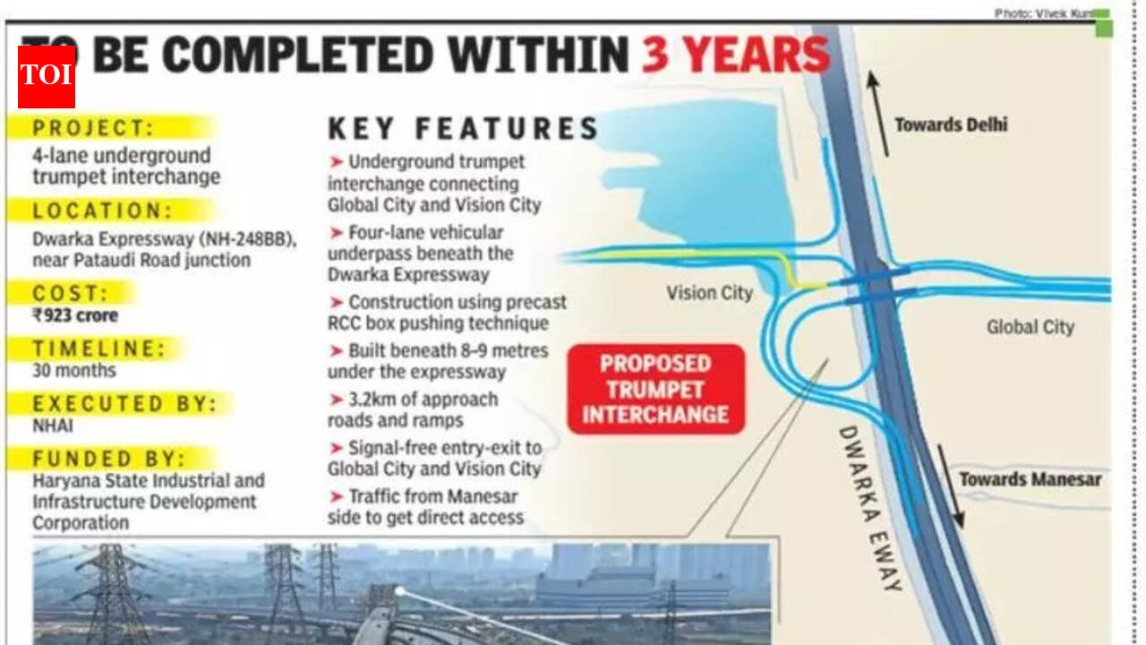 Gurgaon: NHAI has planned to develop a four-lane trumpet interchange along Dwarka Expressway to connect the upcoming Global City and Vision City projects. The underground trumpet interchange will provide signal-free connectivity between the expressway and the two upcoming residential and commercial»»»