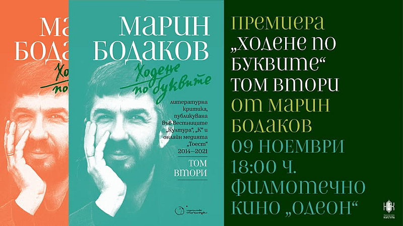 Над сто рецензии и критически текстове на Марин Бодаков (1971–2021) са събрани във втория том на „Ходене по буквите“. Премиерата на книгата ще се състои тази вечер, 9 ноември, от 18:00 часа във филмотечно кино „Одеон“, съобщиха от издателство „Точица“. По време на събитието ще се проведе разговор з»»»