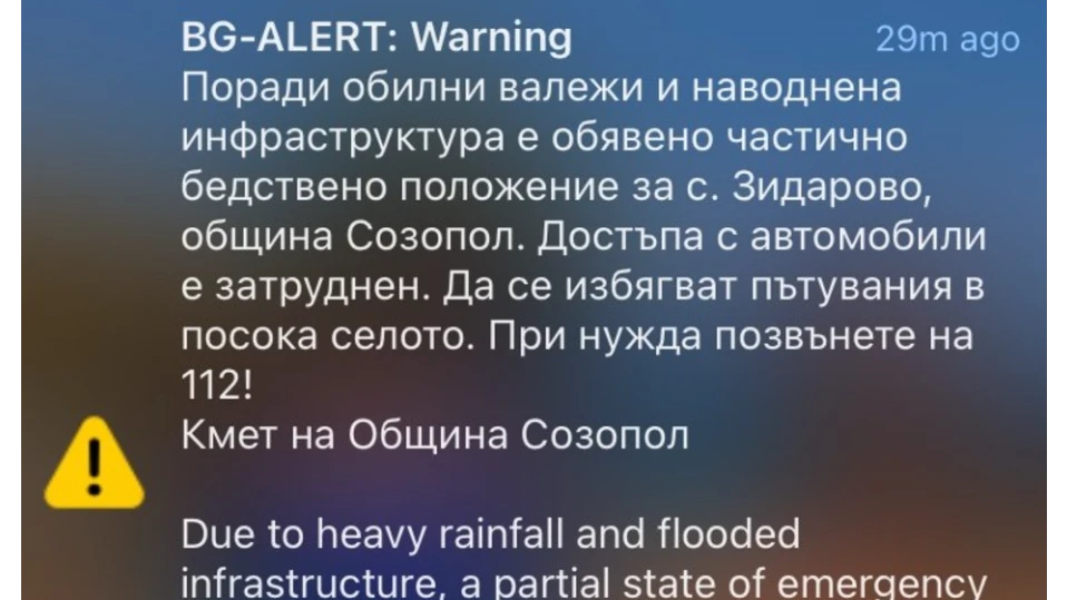 Обявиха частично бедствено положение в Зидарово Още по темата: Задействаха BG-ALERT в царево и четири бургаски села 06.12.2025 14:51 Предупреждение от BG-ALERT беше издадено за частично бедствено положение созополското село Зидарово. "Поради обилни валежи и наводнена инфраструктура е обявено частич»»»