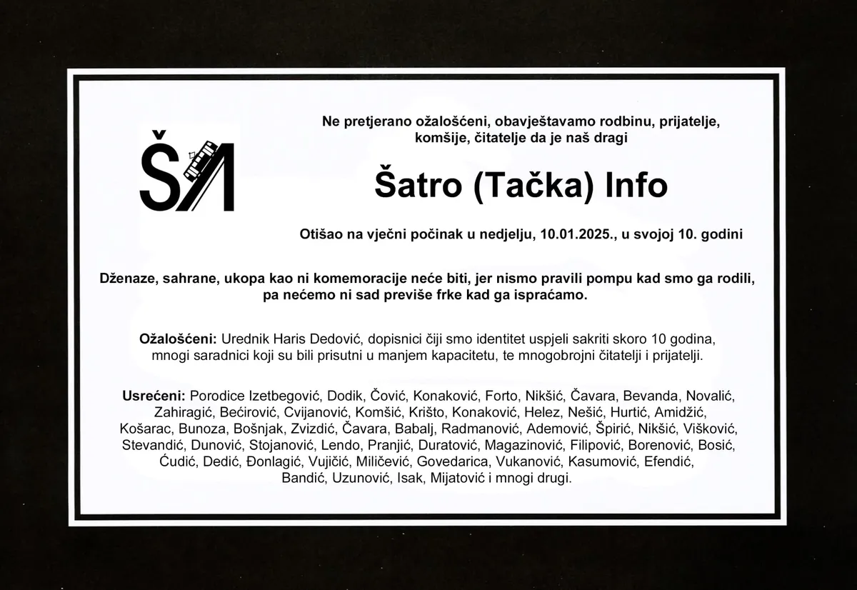 Satirični portal Šatro.info objavio je kako je stigao kraj njihovom radu nakon više od devet godina. Na Facebooku su objavili i simobličnu smrtovnicu, a spisak "usrećenih" je podug. Podijeli Oglas Tokm ovih godina, Šatro.info je pisao parodije na svakodnevnu društveno-političku situaciju, nasmijava»»»