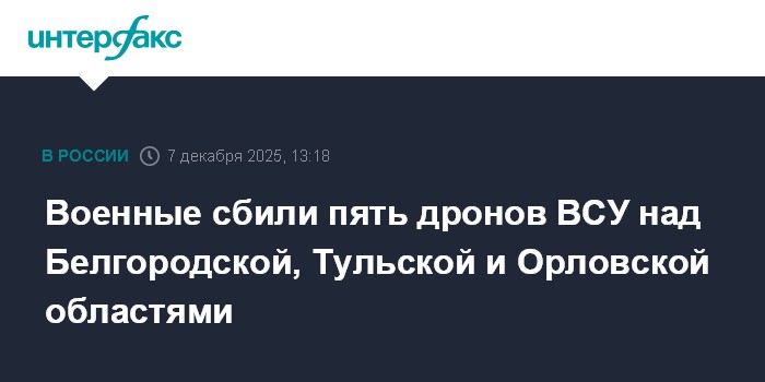 Москва. 7 декабря. INTERFAX.RU - Дежурные средства противовоздушной обороны с 8:00 до 13:00 уничтожили пять украинских беспилотников самолетного типа над тремя российскими регионами, сообщили в Минобороны РФ в воскресенье. По данным военных, по два дрона сбито над Белгородской и Тульской областями,»»»