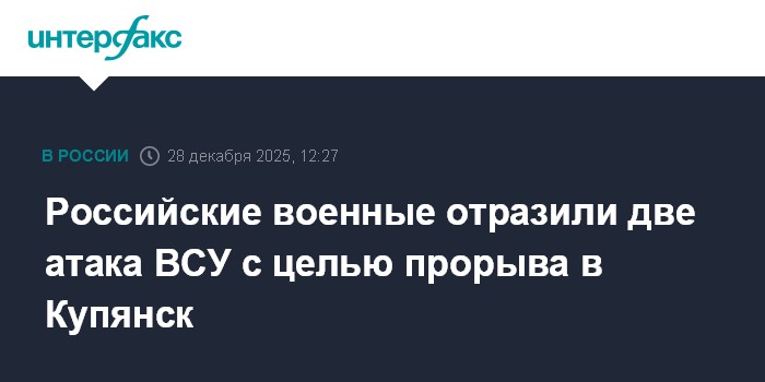 Есть обновление от 12:33 → Военные РФ установили контроль над шестью населенными пунктами в зоне СВО Москва. 28 декабря. INTERFAX.RU - Российские военные за сутки отразили две атаки вооруженных сил Украины с целью прорыва в город Купянск в Харьковской области, сообщило Минобороны России в воскресен»»»