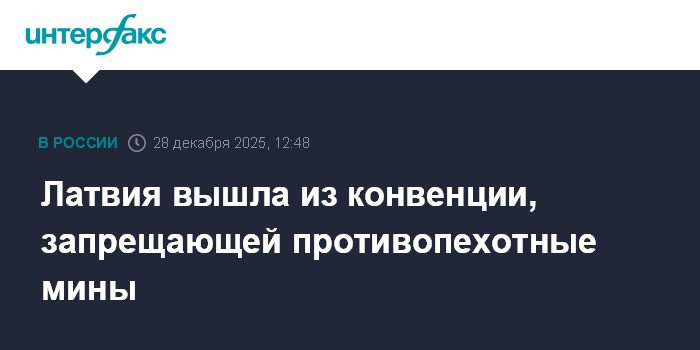 Москва. 28 декабря. INTERFAX.RU - Латвия с 27 декабря официально вышла из конвенции о противопехотных минах (Оттавская конвенция), сообщила пресс-секретарь министерства иностранных дел Диана Эглите. "27 декабря вступило в силу решение Латвии о выходе из Оттавской конвенции, запрещающей использовани»»»