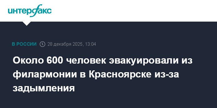 Москва. 28 декабря. INTERFAX.RU - Около шестисот человек были эвакуированы из здания Красноярской филармонии в воскресенье, сообщает пресс-служба ГУ МЧС России по региону. "Сегодня в 14:59 (10:59 по Москве - ИФ) поступило сообщение о задымлении на первом этаже в городе Красноярске на проспекте Мира»»»