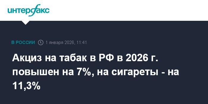 Москва. 1 января. INTERFAX.RU - Акциз на табак (трубочный, курительный, жевательный, сосательный, нюхательный, кальянный) в РФ в 2026 году по сравнению с 2025 годом вырос на 7%, на сигареты - на 11,3%. Согласно изменениям в Налоговый кодекс, акциз на табак в 2026 году установлен в 5 183 рубля за 1 »»»